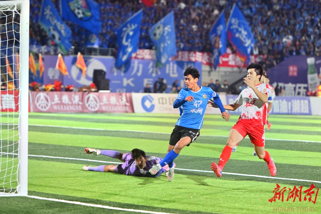“湘超”永州隊(duì)打破長(zhǎng)沙隊(duì)“零失球”金身。郭立亮 攝